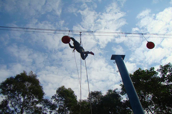 學(xué)員爬上7米高的跳臺(tái),在跳臺(tái)上奮力跳出拍打汽球。這個(gè)項(xiàng)目主要訓(xùn)練學(xué)員克服心理障礙、建立良好的心理素質(zhì)及自信心,果斷的